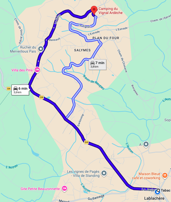 Depuis le village de Lablachère, prenez la route de Saint Laurent les bains, puis tourner à droite pour rejoindre le chemin du Fabre pour arriver au camping par le haut. Sur la D4 il faut suivre le deuxième panneau indiquant le camping du Vignal. Le premier panneau faisant passer par l’autre itinéraire sur la carte.